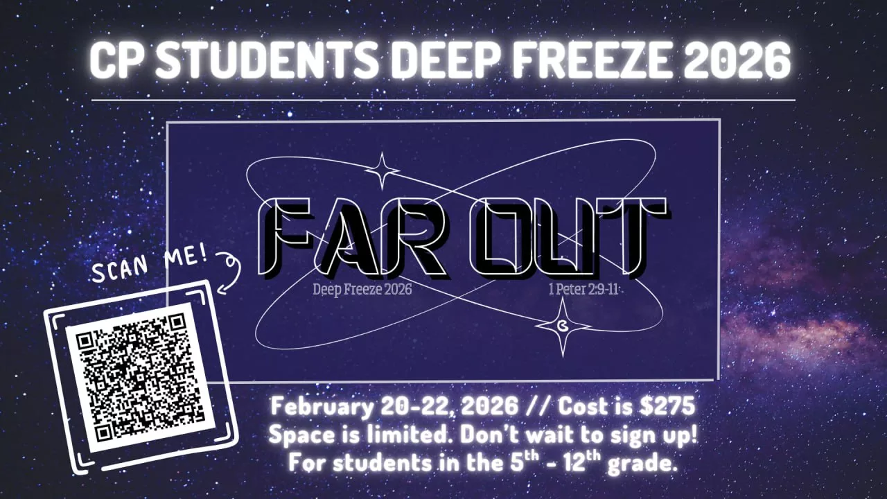 CP STUDENTS DEEP FREEZE 2026 for students 5TH TO 12TH GRADE will be taking place at Camp Berea Feb. 20-22, 2026. Space is limited and the cost is $275.