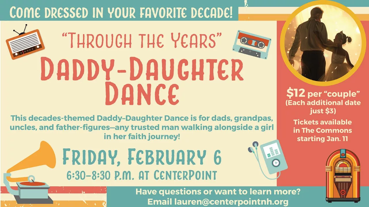 Dads & Daughters, make plans now for the “Through The Years” Daddy-Daughters Dance Feb. 6 from 6:30 – 8:30 PM at CenterPoint. Come dressed in your favorite decade. The event is for dads, grandpas, uncles and other father figures – any trusted man walking alongside a girl in her faith journey.