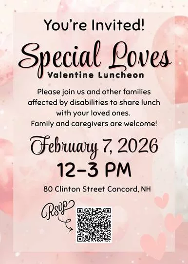 Special Loves Valentine Luncheon – you are invited to join families affected by disabilities to share lunch with your loved ones. Family and care givers are welcome. February 7, 2026 from 12-3 pm at Trinity Baptist Church 80 Clinton St. Concord.