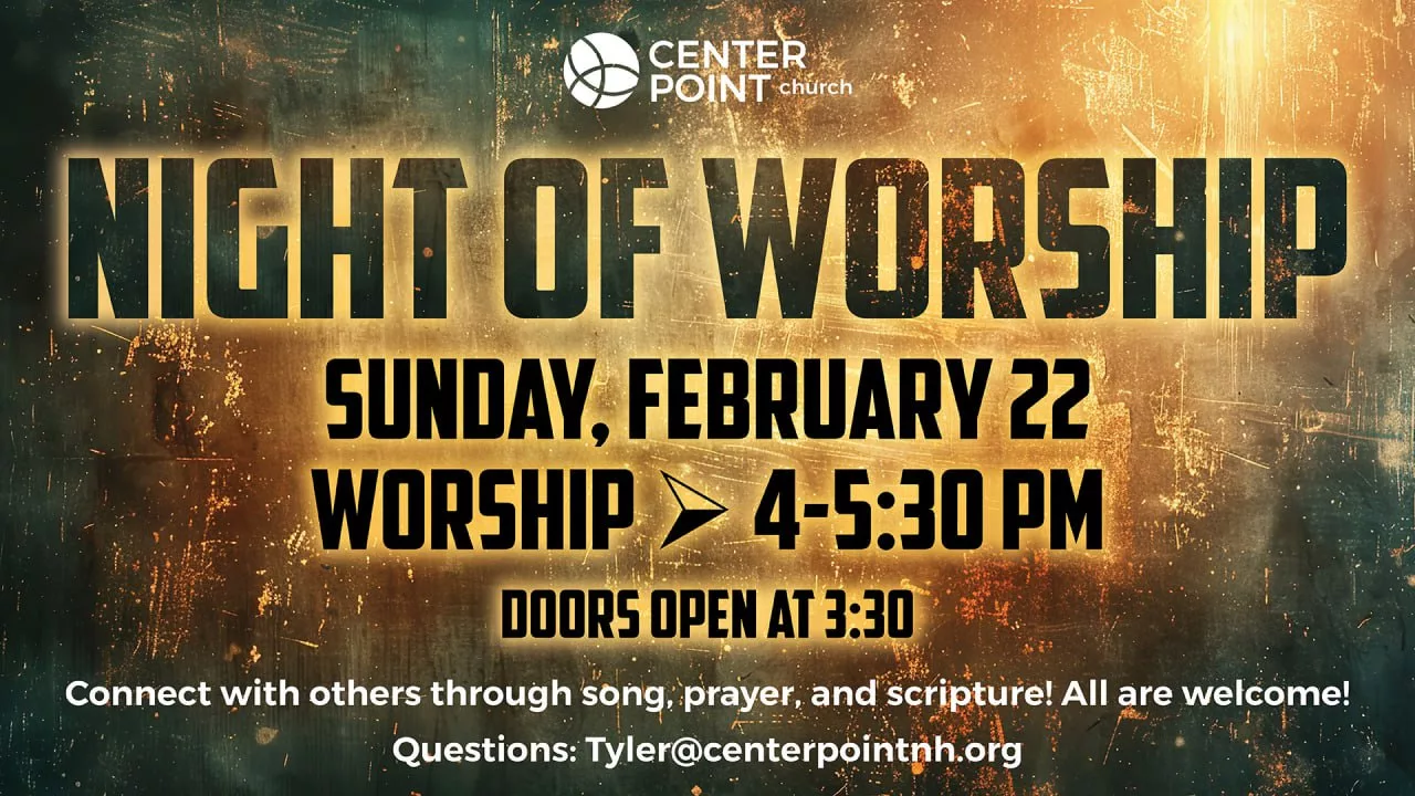 Let’s lift up Jesus together with a Night of Worship on Sunday Feb. 22nd from 4:00 to 5:30 (doors open at 3:30). Connect with others in community through song, prayer and scripture. All are welcome. Questions, contact: tyler@centerpointnh.org