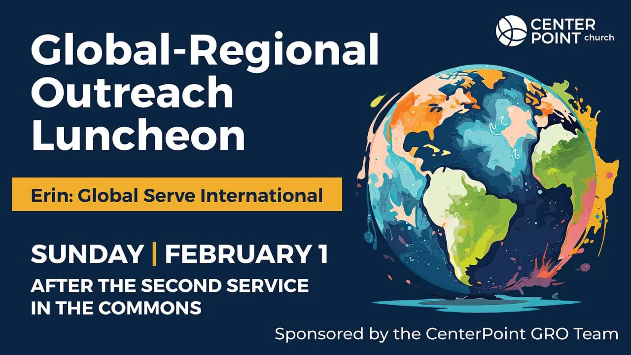 The Global-Regional Outreach Luncheon is happening Sunday Feb. 1 after the second service in the Commons. Come hear about what’s happening in Global Serve International while enjoying a lunch put together by the GRO team.
