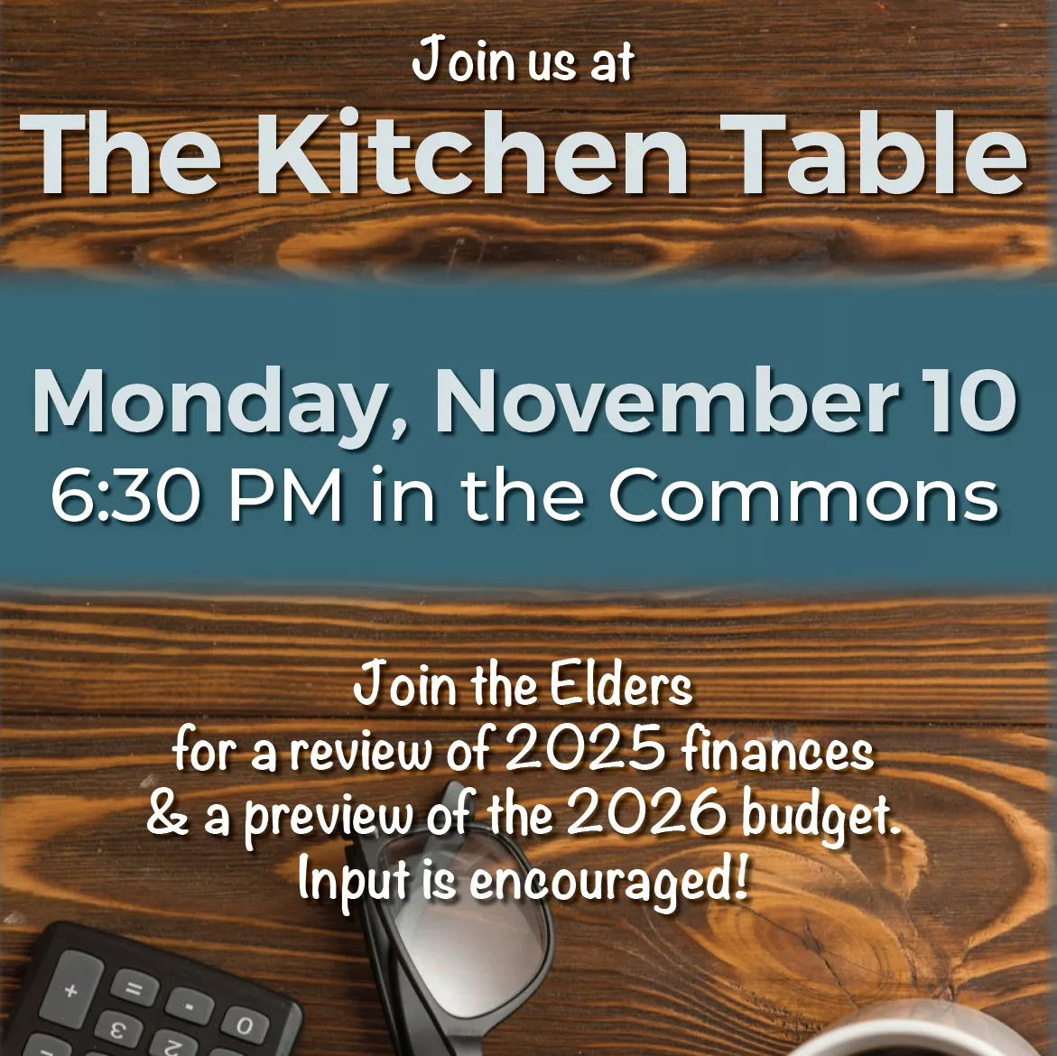 A Kitchen Table meeting is scheduled for Monday evening, November 10th . Currently, the Elders are doing a financial review of 2025 along with working through the CenterPoint budget for 2026. At this point in the process, a ‘Kitchen Table’ meeting is planned for Monday November 10th in the Commons starting at 6:30 pm.