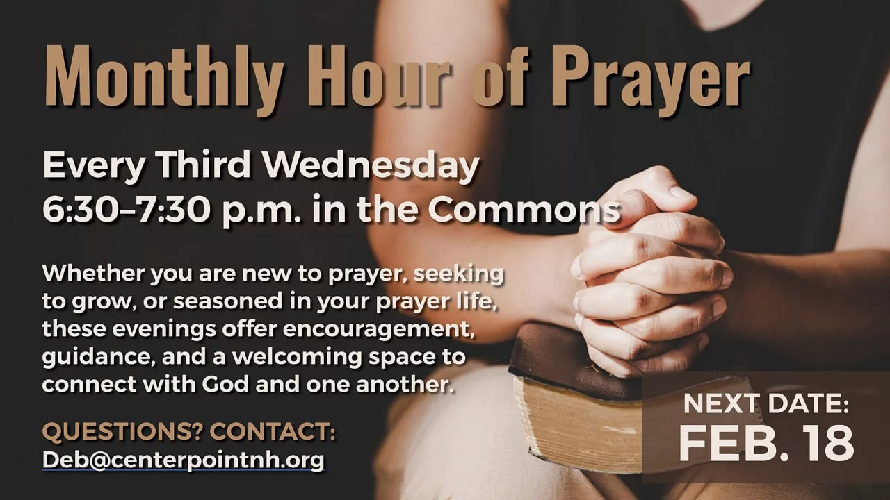 CenterPoint’s Monthly Hour of Prayer Wednesday, Feb. 18th Whether you are new to prayer, seeking to grow your prayer life or are a seasoned prayer warrior, these evenings will offer encouragement, guidance and a welcoming space to connect with God and one another.