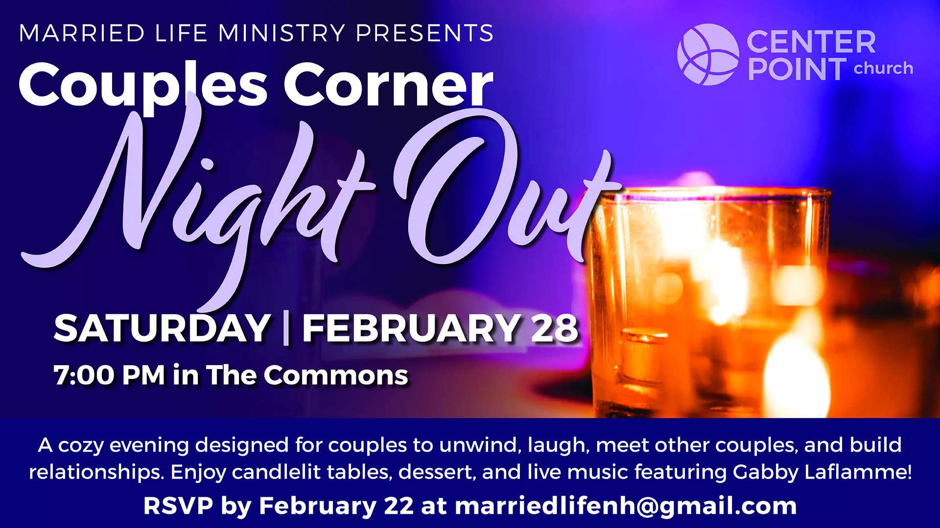 CenterPoint’s Married Life Ministry presents Couples Corner Night Out Saturday Feb. 28th starting at 7 pm in the Commons. Plan on a cozy evening for couples to unwind, laugh, get to know one another, while enjoying dessert and live music together. Please RSVP by Feb. 22 at marriedlifenh@gmail.com