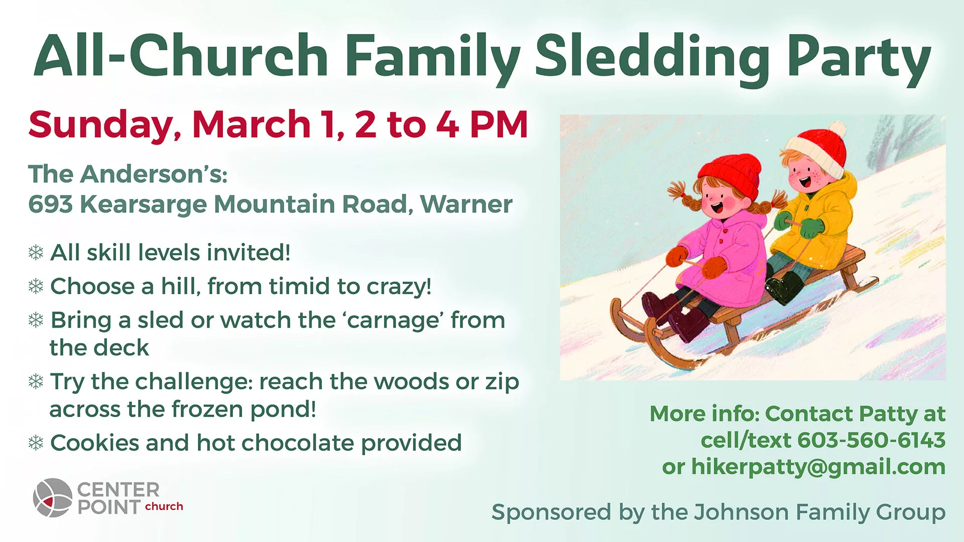 All Church Family Sledding Party at the Anderson’s, Sunday March 1, from 2 to 4 PM. Meet up at 693 Kearsarge Mtn. Rd, Warner, NH. Bring your own sled or watch the fun from the deck.