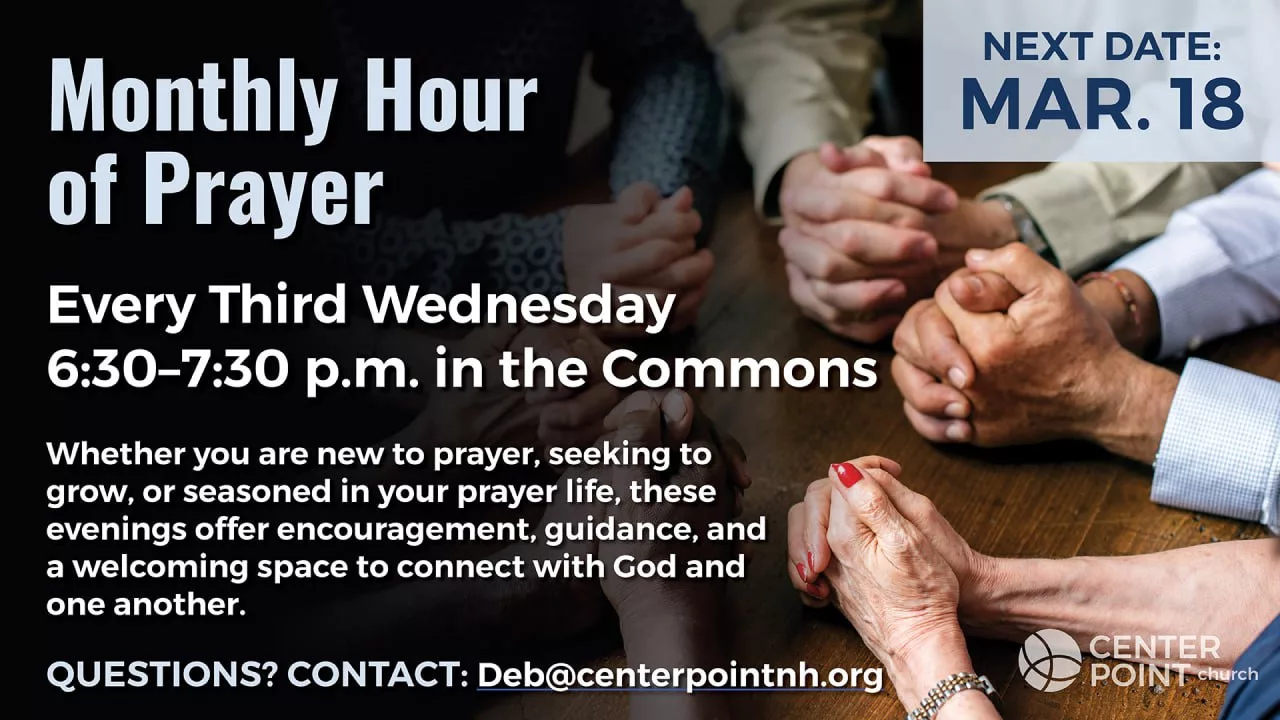 CenterPoint’s Monthly Hour of Prayer Wednesday, Mar. 18th Whether you are new to prayer, seeking to grow your prayer life or are a seasoned prayer warrior, these evenings will offer encouragement, guidance and a welcoming space to connect with God and one another.