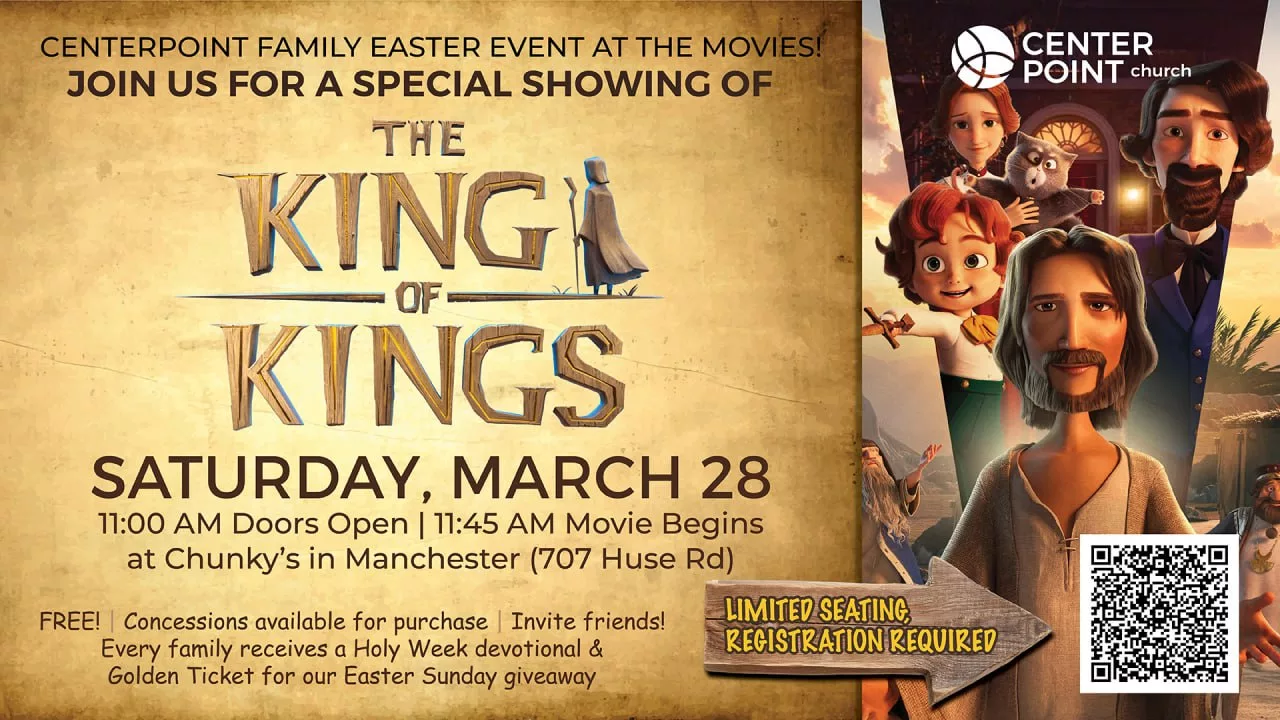 CenterPoint’s Family Easter Event - At the movies Saturday March 28th. There will be a special showing of The King of Kings at Chunky’s in Manchester (707 Huse Rd. starting at 11:45am (doors open at 11am). Tickets are free, (concessions available for purchase).